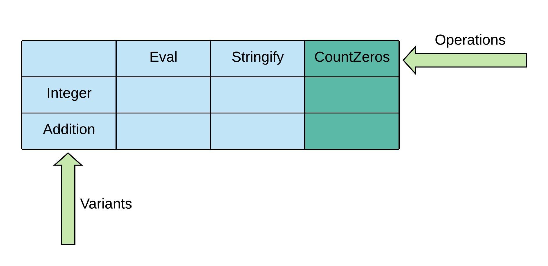 In OOP, it’s hard to add a new operation in exactly the same way it was hard in FP to add a new variant. In our example, CountZeros “gets in the way” of the existing variants, meaning they need to be modified to support it: